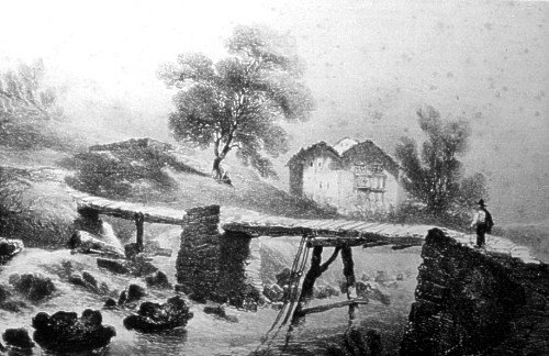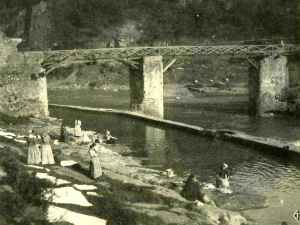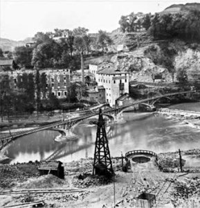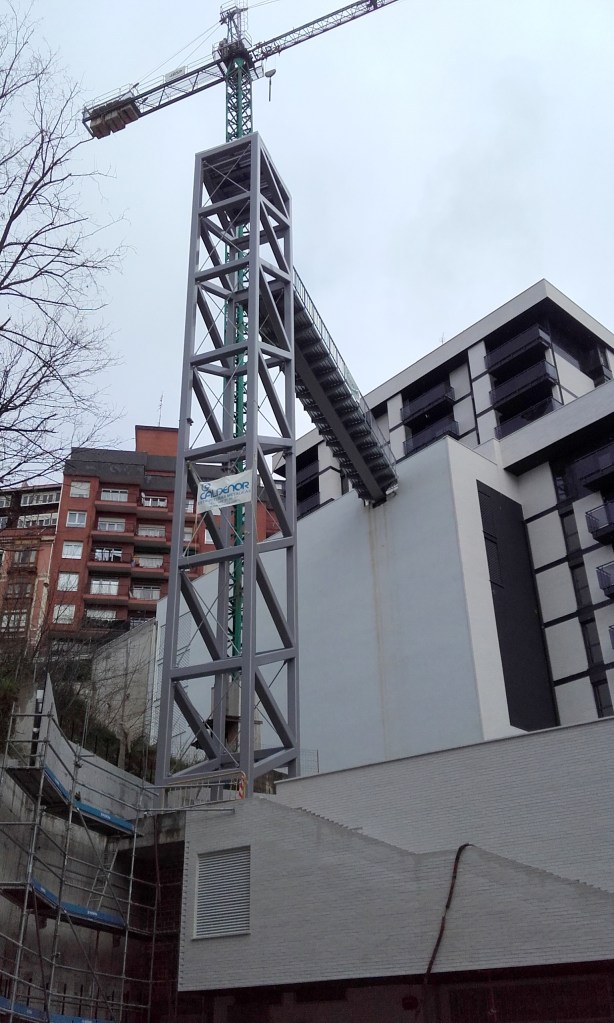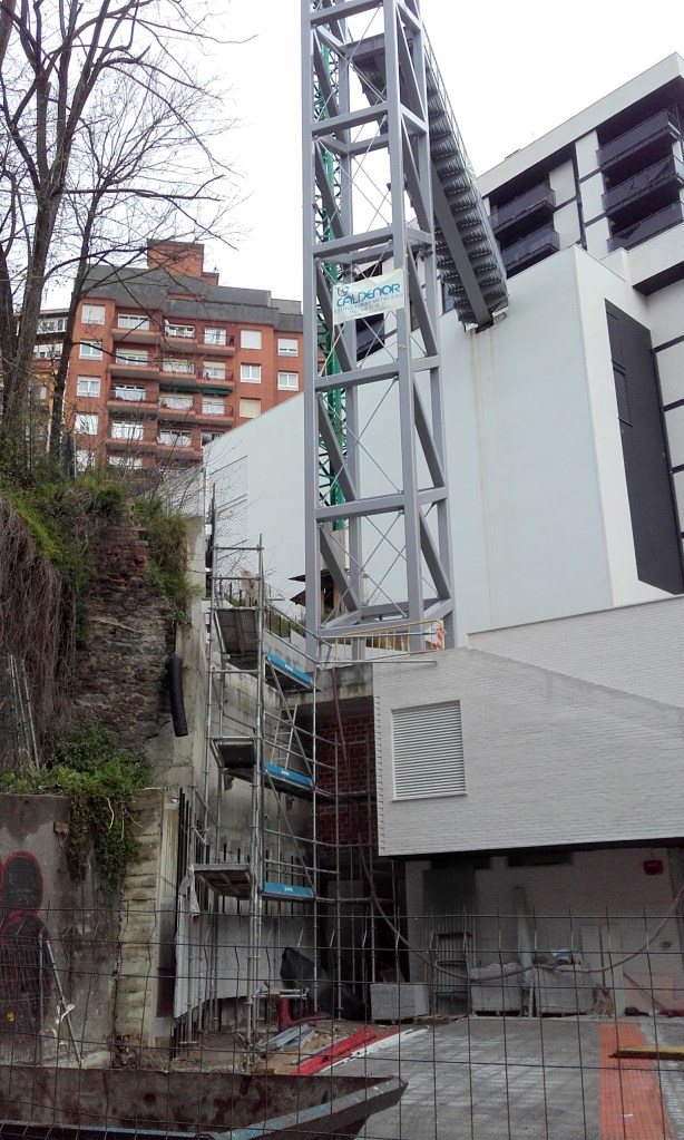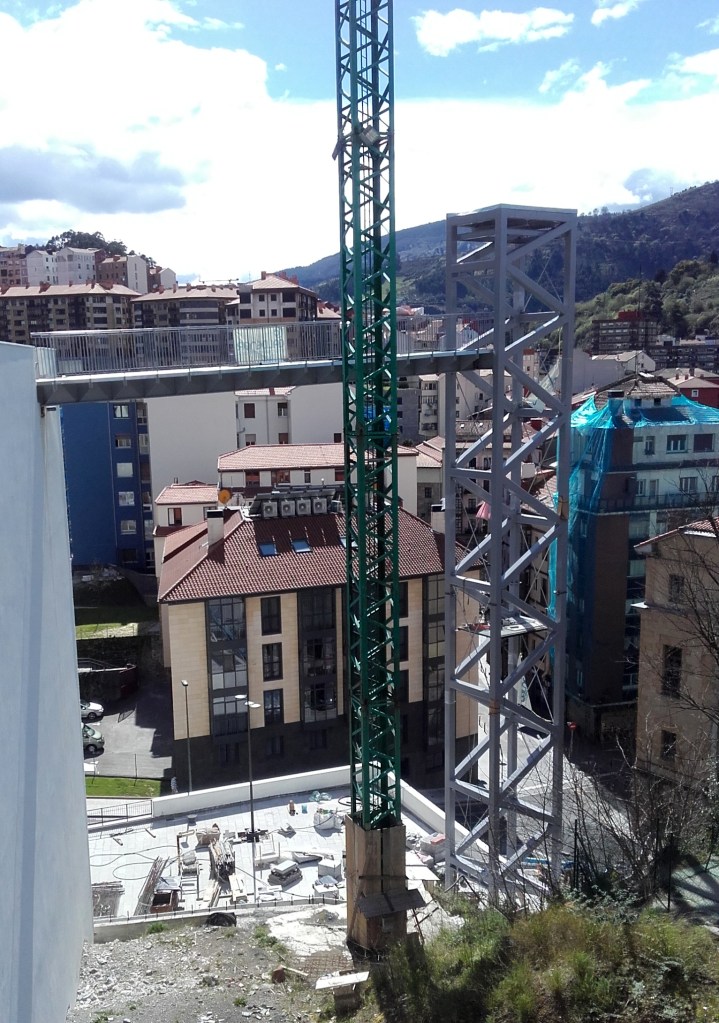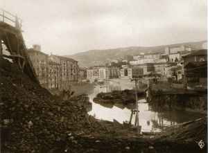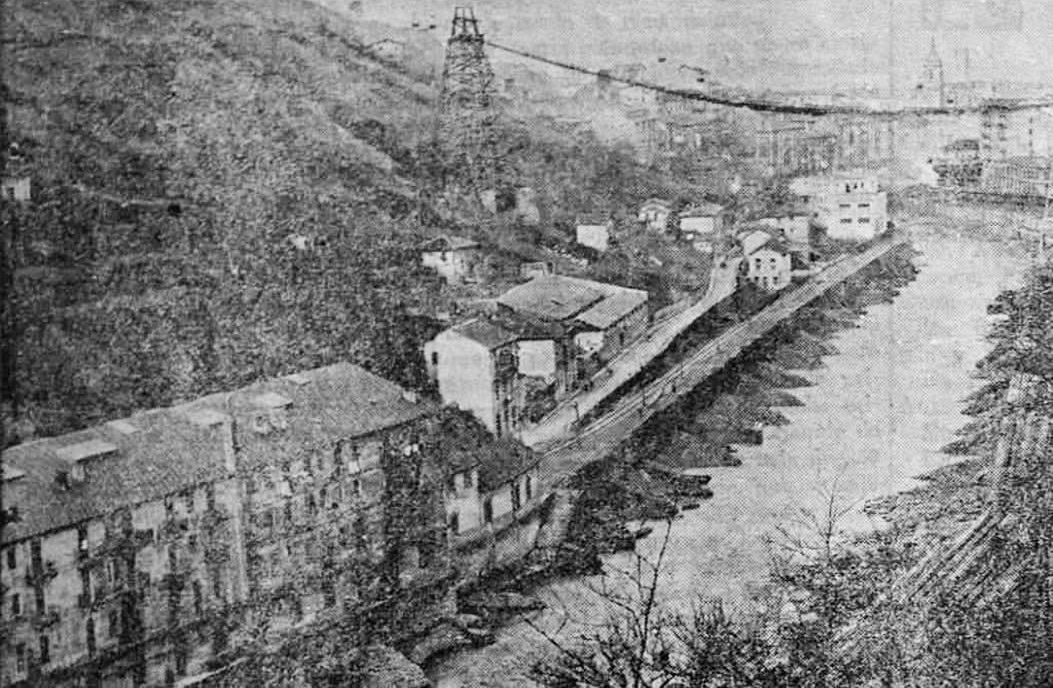 Teleférico para transporte de material en Atxuri, justo sobre el paseo de los Caños. Todavía hoy hay algún rastro de la construcción. 1890