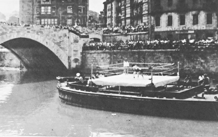 Lucha libre sobre un ring encima de una gabarra. En los años 70, unos cuantos gimnasios de Bilbao hacían exhibiciones de lucha libre americana, a la altura del puente San Antón.