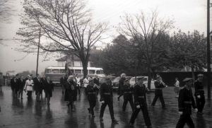 Guardias miñones de Vizcaya con uniforme de gala desfilando con música por una calle de Begoña. Archivo Histórico de Euskadi. Fondo Germán Elorza