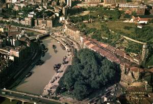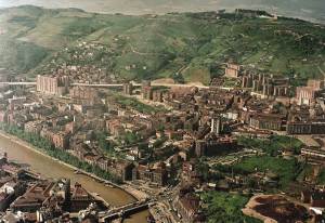 Vista de Bilbao en 1875. Fotografía Coloreada de Charles Monney. En el centro el antiguo «Teatro de la Villa». Lo que hoy llamamos puente del Arenal unía esta parte de la ciudad con la ante iglesia de Abando, cuyo paso estaba sujeto a peaje, tal como se aprecia en la fotografía. La iglesia de San Nicolás, con su reloj de esfera negra. Detrás, el cementerio de Mallona, construido por orden francesa a principios de siglo. Al fondo se ve la basílica de Begoña