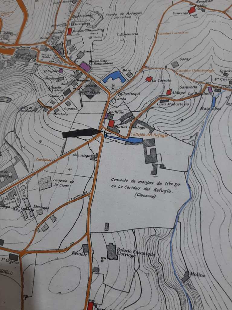En la siguiente imagen de 2022 de Kaixo se ve el lugar exacto donde está sacada esta foto. Fijaros en el platanero de tres ramas que todavía existe. Al fondo de la foto se aprecia el Palacio encantado, que estaba a la izquierda del actual puente de Txurdi viéndolo desde Txurdi. A la derecha de la fuente se ve una puerta con una reja metálica, esa es la entrada al convento del Refugio. A la izquierda estaba el sindicato de Begoña y Gallaga. En el siguiente mapa de la época está señalado con una flecha el punto exacto donde está sacada la foto.
