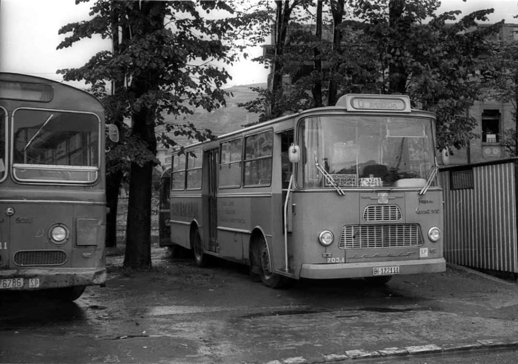 1957. Foto José Félix Echevarria. Se observan las vías del tranvía, con su parada final y al fondo los váteres públicos de madera.