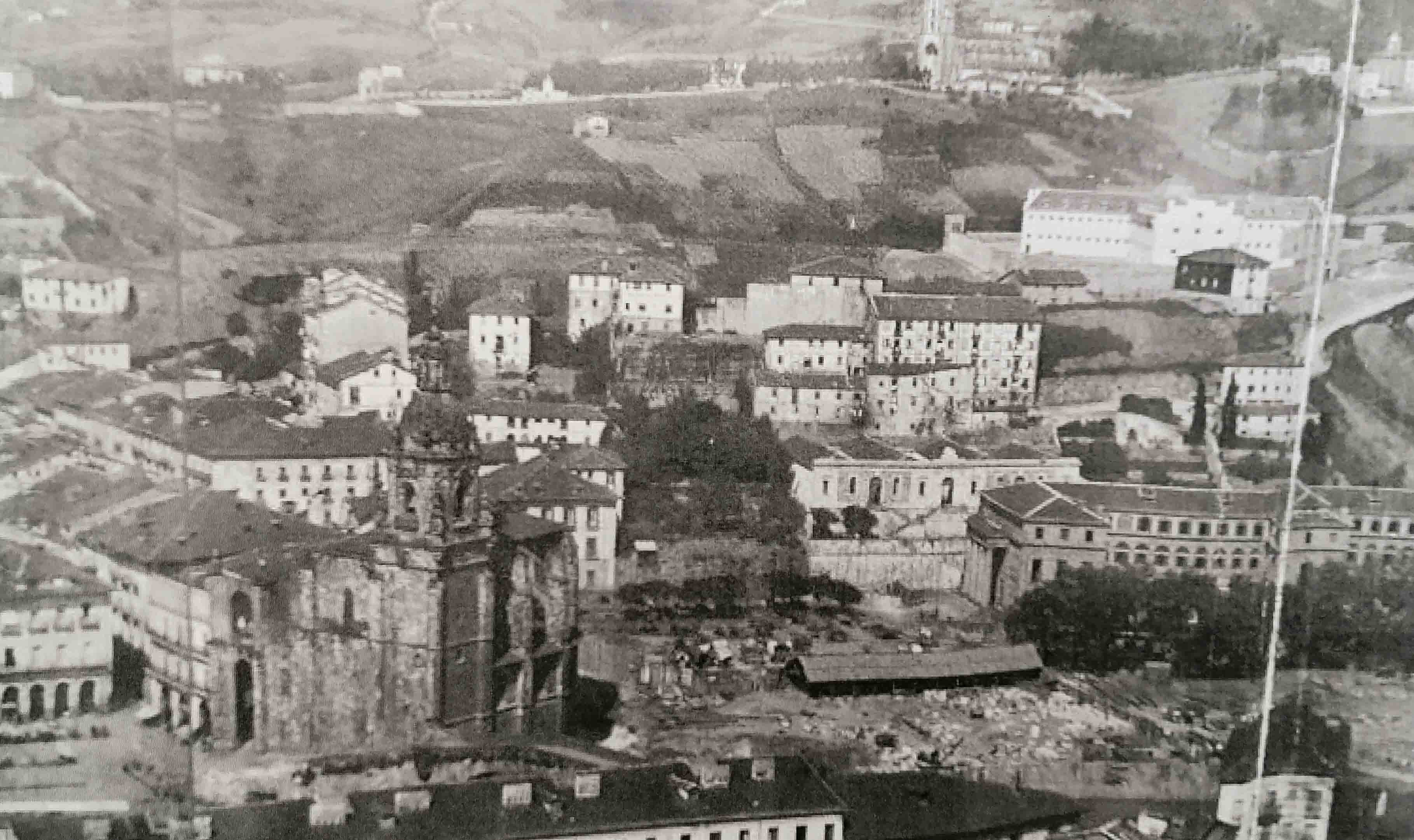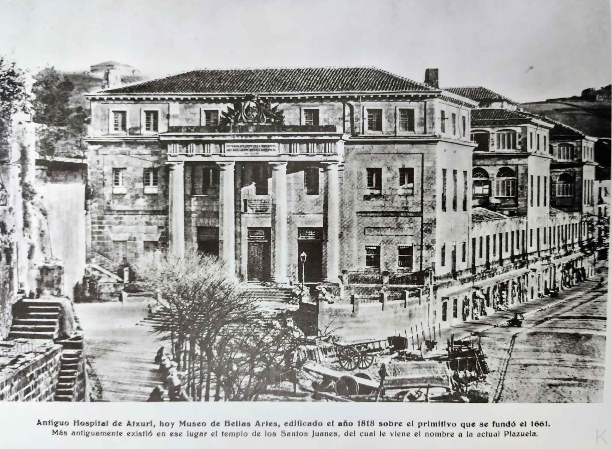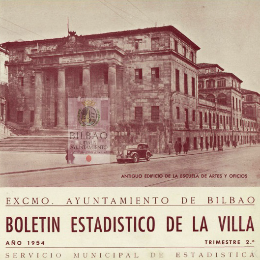 Han dado comienzo las obras del edificio del antiguo Hospital Civil de San Lázaro y San Eusebio, destinado después a Escuela de Artes y Oficios y a Museo. En un principio, en el siglo XV, sirvió para hospicio de peregrinos, y posteriormente, en el año 1661, fue aplicado para la curación de enfermos calenturientos hasta que, el 12 de octubre de 1818, la Junta de Caridad, contando único y exclusivamente con las aportaciones voluntarios de los vecinos de la Villa, se dispuso a acometer la empresa, verdaderamente portentosa, colocando la primera piedra del magnifico edificio que iba a ser Hospital Civil, y que hemos conocido últimamente, con su majestuosa entrada principal por la plaza de los Santos Juanes, que consta de cuatro gruesas columnas sobre las que descansa un tarjetón con la siguiente leyenda: «Enfermos que gemís en la indigencia, aquí hallareis solicita asistencia» Mas tarde, el año 1902, se inició la construcción del actual Hospital de Basurto, y entonces fue cuando el edificio de Achuri se dedicó a fines distintos para los que había sido creado El antiguo Hospital Civil instalado en el edificio que se de arriba, estaba regido por una Junta de Caridad, de caridad auténtico, por cuanto sus miembros velaban por turno, para que de nada careciesen los enfermos. Para el mantenimiento de dicho establecimiento benéfico solo contaba con 24.000 reales anuales de las rentas de sus propias fincas, con una subvención fija de 30.000 reales del Ayuntamiento de Bilbao; y con el producto de una rifa anual autorizada (unos 25.000 reales), además de las limosnas que recibe de los más acomodados y de personas que sentían afinidad con la humanitaria obra del Hospital de Bilbao, que estaba considerado como uno de los mejores de España. La Excma. Diputación Provincial de Vizcaya y el Excelentísimo Ayuntamiento de Bilbao, propietarios del edificio, han condicionado su donación a que, en su derribo, sea respetada la fachada principal del mismo; levantándose, en su lugar, por iniciativa del Ministerio de Educación Nacional, uno moderna construcción destinada a Escuela de Trabajo, para cuyas obras se han presupuestado nueve millones de pesetas. Imagen y texto del boletín estadístico de la villa en el archivo municipal.