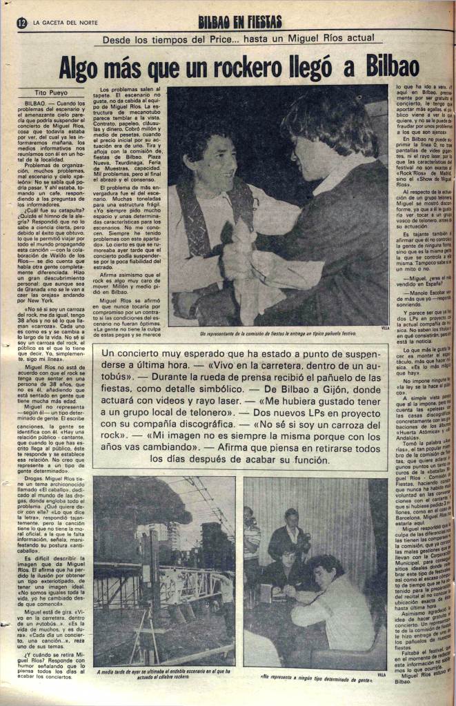 Corría el año 1982 y Miguel Ríos era una de las figuras del rock patrio. Para su concierto, que tendría lugar en Txurdinaga (años antes de inaugurarse el Parque Europa) se esperaban inicialmente unos 10.000 asistentes. Sin embargo, la expectación era tal que las previsiones de aforo tuvieron que revisarse, así como la potencia de luz y sonido. Se calculó que acabaron acudiendo 80.000 personas, una verdadera multitud que el propio artista granadino aún recuerda. Ríos declaraba hace unos años al diario El Correo: “Ahí estuvimos en Txurdinaga, en un lugar rodeado de edificios, y hacíamos guiños a los que nos veían desde sus casas. Me acuerdo de que les pedíamos que encendieran las luces y las apagaran… Los viejos trucos para entretener al personal». De los 45 minutos de show previstos se realizaron 80, que podéis ver al completo en este vídeo…