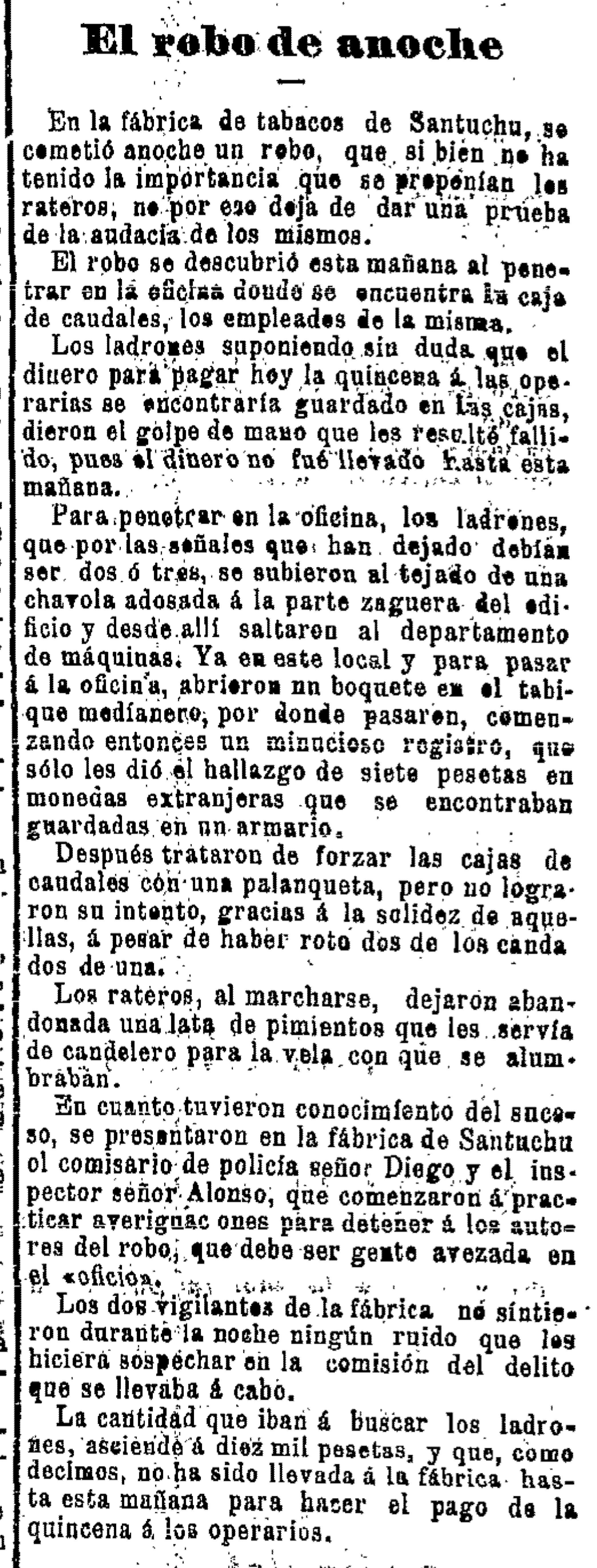 Un frío día de Febrero del año 1889 saltó la noticia en el NOTICIERO BILBAINO de las pésimas condiciones laborales a las que estaban sujetas las sufridas cigarreras. Aquellas trabajadoras de la Compañía Tabacalera en Santutxu realizaban jornadas de 13 horas bajo una presión inhumana.